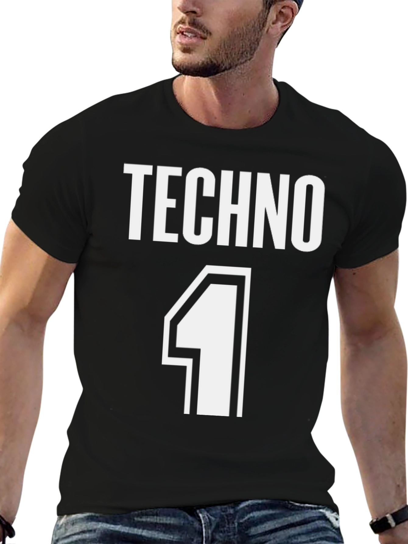Rock the rave scene with this bold and stylish Techno #1 T-shirt. The shirt features a crisp white "TECHNO" graphic printed above a large number "1", giving it a distinct, sporty edge. Made from a comfortable, dark-colored fabric, this tee is perfect for a night out dancing, casual wear, or showing your love for the electronic music scene. The design is eye-catching and modern, making it a great conversation starter. Whether you're a DJ, a dancer, or just a fan of techno music, this shirt is a must-have addition to your wardrobe. Show your passion for the music and turn heads wherever you go.